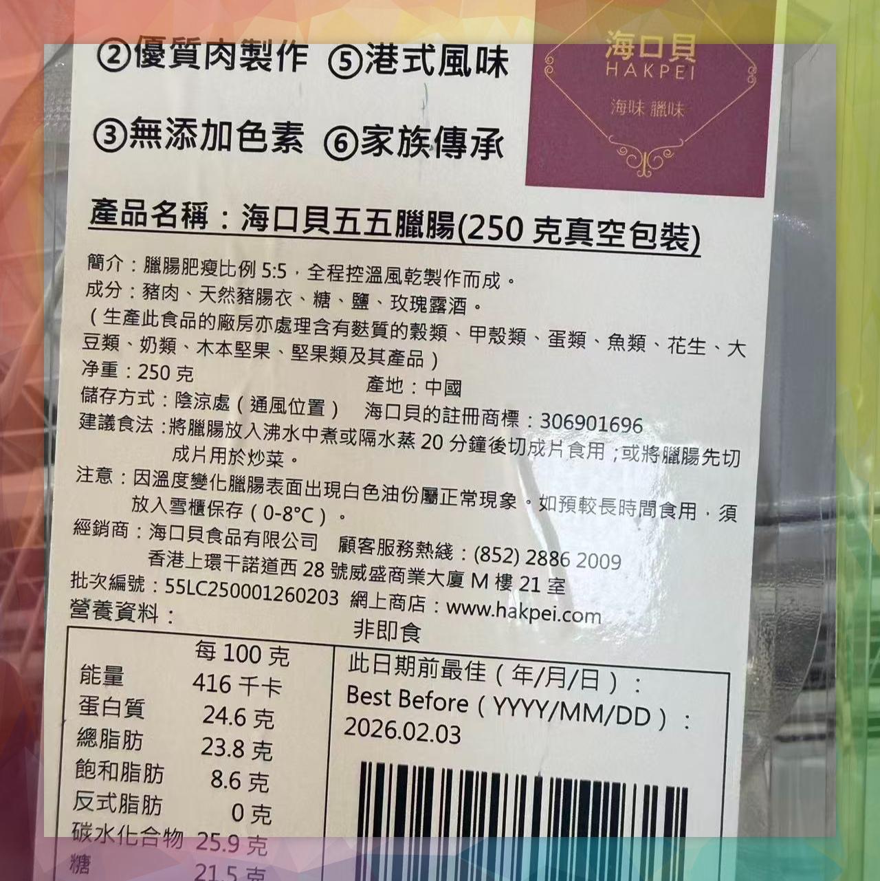 秋風起,食臘味。海口貝臘腸:酒味香醇,臘香味濃,優質風味,必定成為您秋冬季節的必嚐滋味。