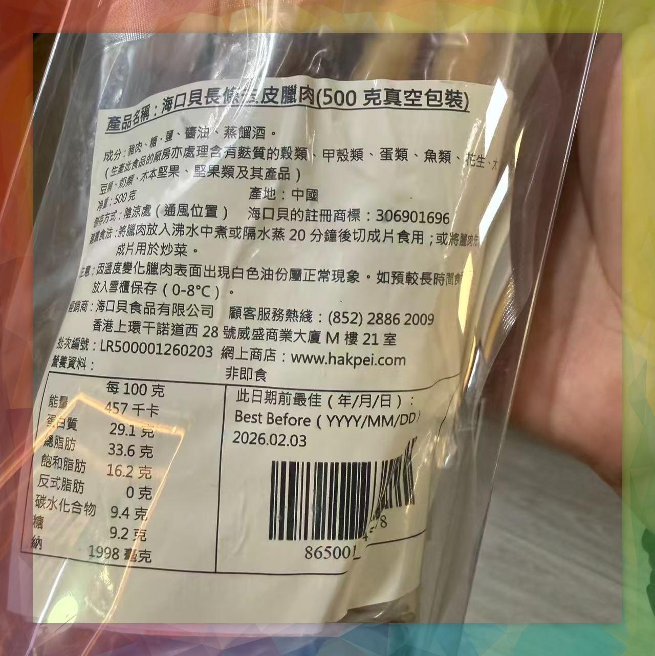 注意:因溫度變化臘肉表面出現白色油份屬正常現象。如預較長時間食用,須放入雪櫃保存(0-8°C)。